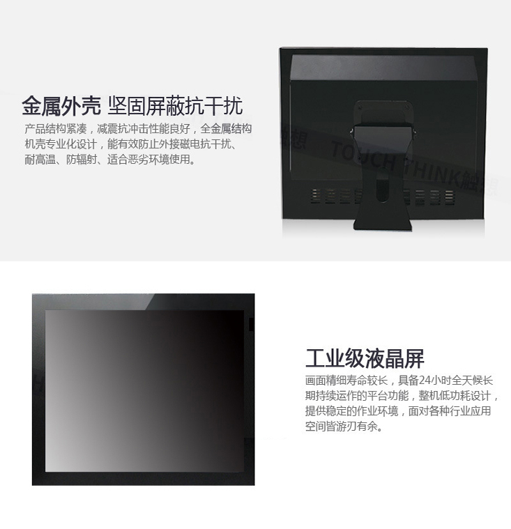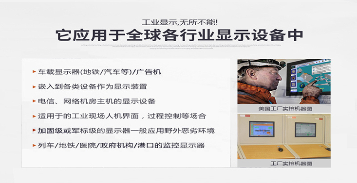 創視紀工業顯示器就是應用在工業控制過程或設備的顯示器。它與民用或商用的顯示器的主要區別是外殼設計一般采用全鋼設計,面板分為普通鐵板、不銹鐵、不銹鋼、鋁面板等不同材質,防塵、防震的特殊設計,采用工業級的液晶顯示屏,在對環境要求較高的情況下,考慮采用寬溫(-40至85度)的液晶顯示屏,創視紀工業顯示器的防塵等級最高為6,防水最高為8 。