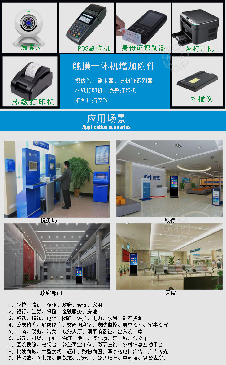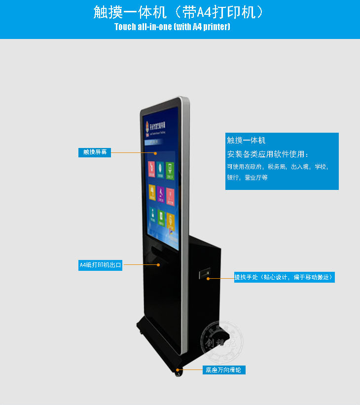 觸摸屏查詢一體機帶A4打印機功能,是一款智能觸摸查詢打印設備。它集觸控、液晶顯示、電腦主機,A4打印機于一體,可用于觸控互動、查詢信息政府辦公、銀行打印流水賬單,稅務局打印稅務資料,車管所打印證件資料等。觸摸一體機主體由流暢的直線構成,簡約,時尚,符合現代社會流行趨勢。整體造型設計利于人體機學設計,使用戶擁有更舒適、更便捷、更貼心的視覺觸覺雙重體驗。