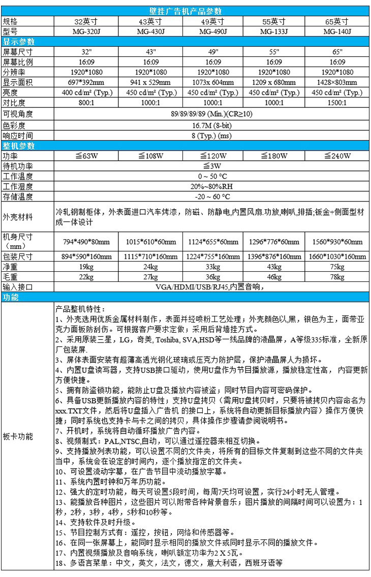 產品名稱: 32/43/49/55/65英寸壁掛樓宇廣告機
