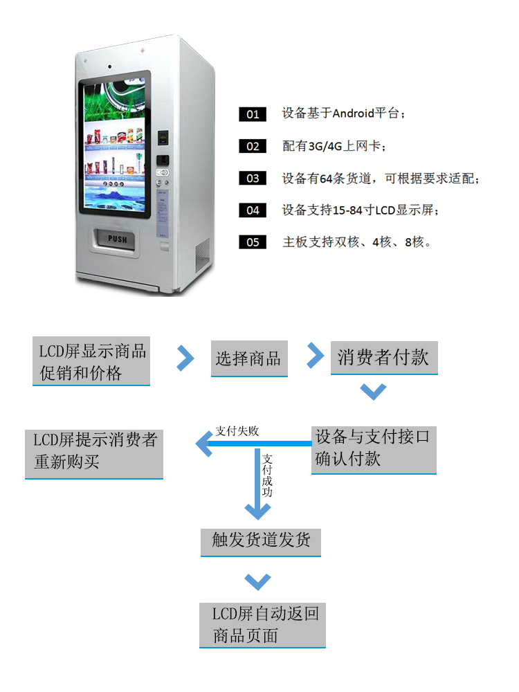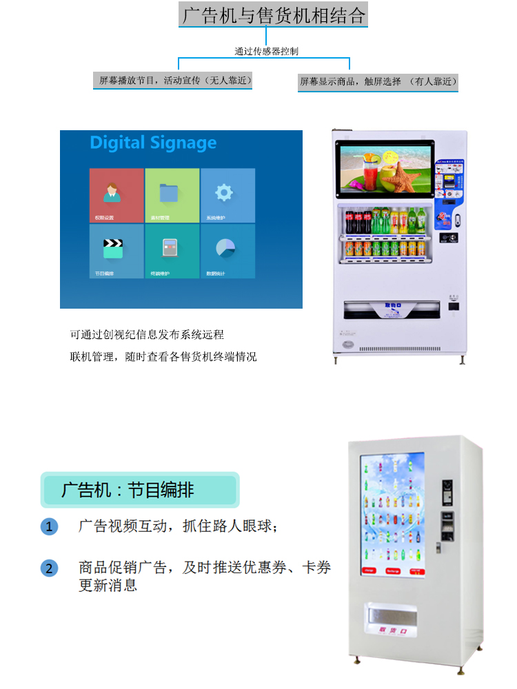 設(shè)備不僅僅具有售貨功能,更能遠程聯(lián)機對各終端進行操作和管理,同時,個性的LCD廣告顯示屏播放商品廣告,及時推送消息,更具多元化、高定制化的特點。贏得眾多商家的喜愛,