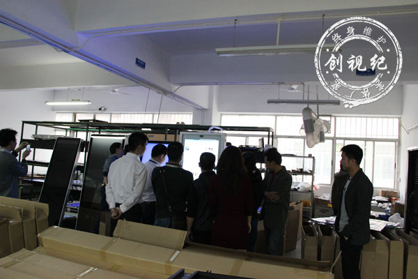 5、各企業家參觀公司生產平臺、老化平臺,QC平臺,對公司研發的觸摸一體機實現的自動佩戴眼鏡功能饒有興趣。