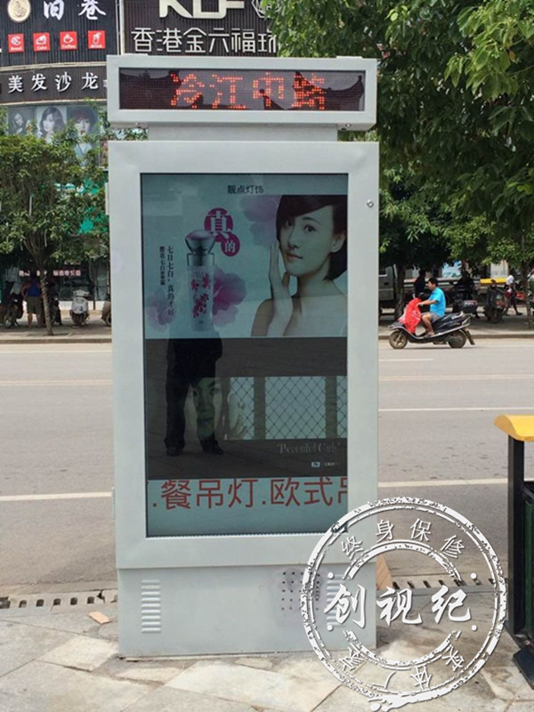 2015年6月29日電,湖南冷江中路,創視紀65寸戶外空調防水廣告機正式調試成功,這標志著深圳梅塞德斯科技有限公司----創視紀廣告機生產廠家,又邁入一個新的臺階,戶外廣告機不同于普通的室內廣告機,戶外廣告機要求達到國際標準IP65,對防水防塵防雷耐高溫有著極高的要求,對廣告機廠家的生產工藝有著極嚴格的規范,此批的戶外廣告機,因為是用在站臺旁,所以廣告機上方特別加了一個LED的顯示屏,用來顯示各路段,廣告機的背面屏幕是安裝的滾動燈箱,兩種工藝,使得這臺65寸的戶外廣告機更全面性,需要的趕緊來電訂購吧!
